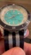 Turquoise dial with bold black bezel. Pre-owned. Comes with two bands. Received as a gift. Unknown brand and I do not have a box. Works perfectly. No scuffs, no scrapes, and no issues whatsoever.
