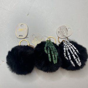 Superstar Lot of 3, NWT, black poof key chains w/ skeleton hands in white green.