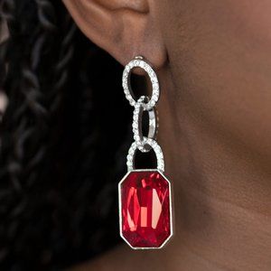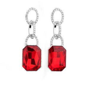 An oversized red emerald-cut rhinestone swings from the bottom of white rhinestone encrusted links, creating a gorgeously dramatic lure. Earring attaches to a standard post fitting.