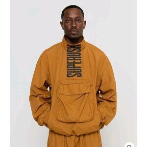 This 1/2 zip up Supervsn windbreaker is new with tags and original packaging. It is a 'big bird' yellow color with black writing. This is supposed to be oversized, see photos for measurements. It is a half zip, nylon windbreaker. There is no hood. There are 3 pockets, 1 front pocket and 2 pockets on either side of jacket. While taking photos, I noticed that there is a small spot to the right upper back of the jacket on the inside, it was something that occurred during production. It does seem like there is some stickiness to it, so I believe it'll come out once washed, I didn't want to wash it as it's brand new. I'm pointing to the spot in a photo and then the photo right after it is the spot with the jacket turned inside-out, hope that wasn't confusing!