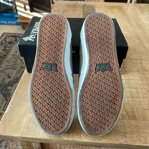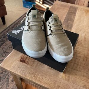Supra Flow Low Top Men's 9 Tan Dark Olive White Suede Canvas Shoes Sneaker come with Original Box does have scuffs in the white trim EUC