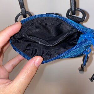 Adjustable strap. Carabiner on backside to add keys/chains & etc.