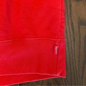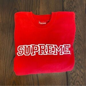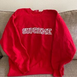 Vibrant red crewneck with iconic Supreme logo. Perfect for casual wear.