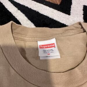 The Supreme Box Logo Tee from Fall/Winter 2023 features the classic Supreme logo on soft khaki cotton — a staple piece for any streetwear collector.