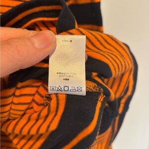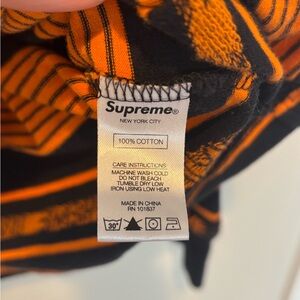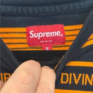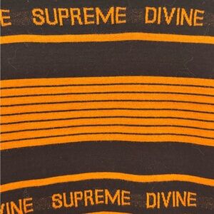 Orange and black striped long sleeve shirt with Supreme Divine branding.