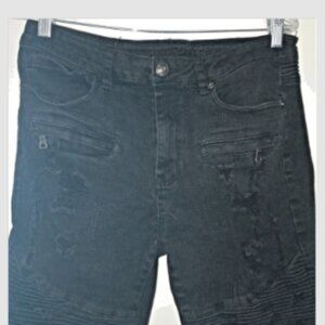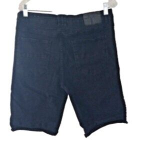 These Rue 21 shorts in size 34 are black cut-offs made of distressed denim with a stretchy fabric blend of spandex and cotton. The mid-rise shorts feature a 5-pocket design, pleated accents, button details, raw hem, and zipper closure. The stylish design includes holes, rips, and tears for a grunge or gothic look, suitable for casual occasions in summer, fall, or spring. With a slimming fit and comfortable shaping, these shorts offer easy care and feature a solid dark wash for easy machine washable maintenance. Perfect for activities like walking or skateboarding.