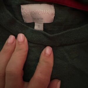Green tee with bold red Supreme logo. Comfortable short sleeves.