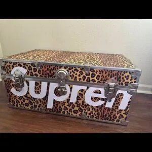 Eye-catching trunk with leopard pattern. Features bold Supreme branding. Ideal for storage or decor.