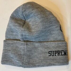 This Supreme beanie features an embroidered MF Doom–inspired graphic in bold black lettering across the crown, set against a heather gray backdrop. Made from 100% acrylic, the beanie is soft, stretchy, and designed with a cuffed edge and understated Supreme logo embroidery. One size fits most. A collectible piece for fans of streetwear and hip-hop culture alike, this beanie adds iconic flair to any cold-weather look