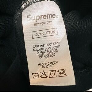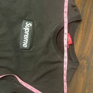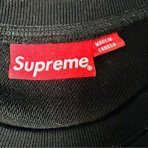 Classic black crewneck sweater by Supreme. Features iconic logo on chest. Ideal for casual wear.