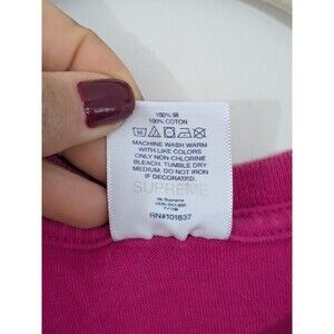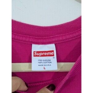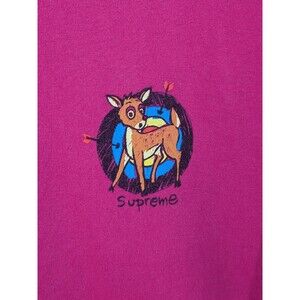 The product is a Supreme Men's Pink Deer Graphic Front and Back Crewneck T-Shirt in size L. This regular fit t-shirt features a crew neck and short sleeves, making it a comfortable and stylish choice for men. The pink color and animal-themed design add a playful touch to the overall look, fitting in with the designer and 90s aesthetic. Perfect for casual wear or as a statement piece to showcase your unique style.