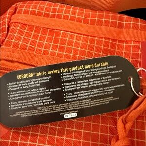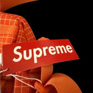 Bold orange Supreme messenger bag with grid design. Features adjustable strap and front logo detail. Ideal for daily essentials.