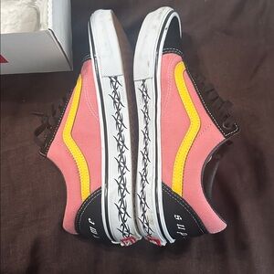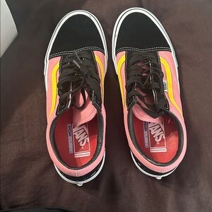 Vibrant pink and yellow design. Black detailing with white soles. Iconic Supreme style.size 9 in box