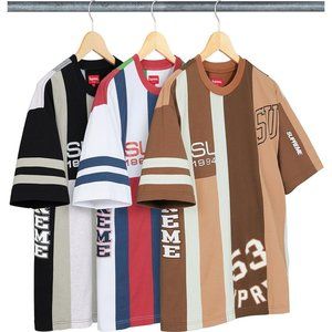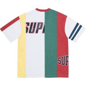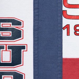 All cotton jersey crewneck with patchwork pattern. Printed logos on front and back with embroidered logo on sleeve.