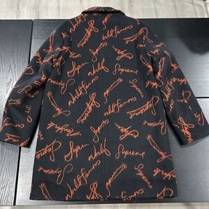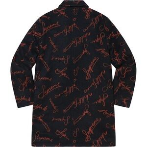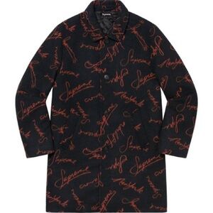 Supreme Script Logos Wool Overcoat in size Medium. Wool blend with a jacquard logo pattern and viscose blend quilted lining. Button front closure with welt hand pockets at lower front and interior chest pocket. Pristine condition. No signs of wear or use. No flaws.