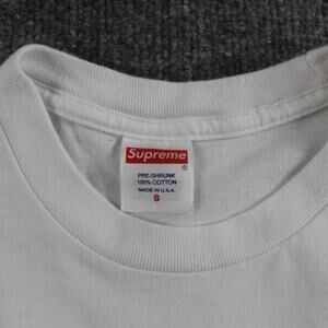 Tag details shown: "Supreme" / "PRE-SHRUNK 100% COTTON" / "MADE IN U.S.A." / "S"