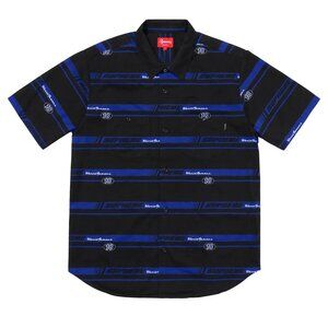 Men's black, cobalt and white Supreme work shirt with Racing Stripe print throughout, point collar, short sleeves, dual button pockets at chest and button closures at front.