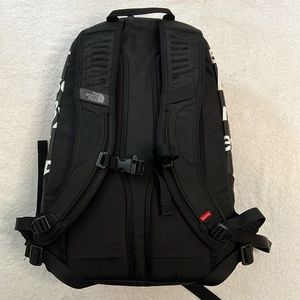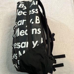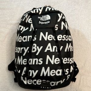 Supreme / The North Face By Any Means Necessary backpack, black and white. Like new - only used a few times. No rips, tears, stains or scuff marks. All labeling is intact. Backpack has a main compartment with a zippered pocket and slot for a laptop. There are several other inside slots that could hold cell phone, keys, etc. (see photos). The dimensions are: 19” X 13” X 6-7” at its widest part. The backpack does taper slightly at the top - goes from 13” to 10-11” across. The material is flexible. All measurements are approximate.