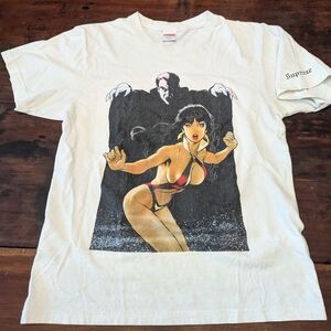 100 % cotton white Supreme, Vampriella T. Unisex medium - additional measurements in photos. Heavily pre-loved with a lot of life left. All flaws pictured - some staining that could probably be treated, some pilling, wear on the graphics. Please see photos. Fast shipping. Please send offers or leave a comment if interested.