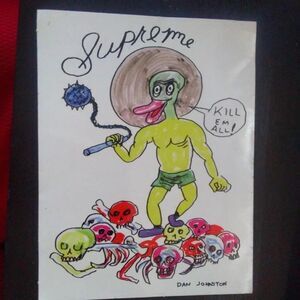 Supreme dan Johnston Box logo multi color sticker Rare #supreme #supremenewyork #supremeny #supremenyc #raresupreme Dead stock Promo Daniel Dale Johnston (January 22, 1961 c. September 11, 2019) was an American singer-songwriter and visual artist regarded as a significant figure in outsider, lo-fi, and alternative music scenes.[1][2] Most of his work consisted of cassettes recorded alone in his home,[4] and his music was frequently cited for its "pure" and "childlike" qualities. Guardian.[5] This led to various exhibitions and art shows showcasing his works.[6]Johnston spent extended periods in psychiatric institutions[4] and was diagnosed with bipolar disorder.[6][1] He garnered a local following in the 1980s by passing out tapes of his music while working at a McDonald's in Dobie Center in Austin, Texas.[7][8] His cult status was propelled when Nirvana's Kurt Cobain was seen wearing a T-shirt that featured artwork from Johnston's 1983 cassette album Hi, How Are You.