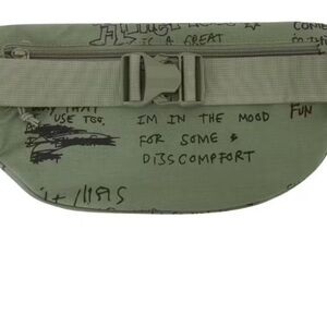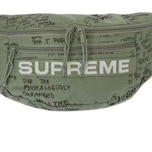 Trendy Supreme belt bag in olive green. Features bold branding. Ideal for daily wear.