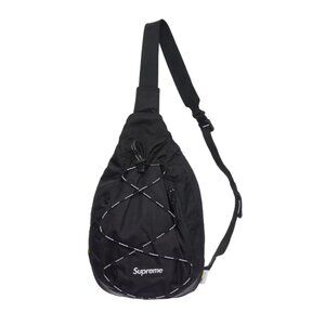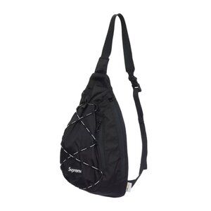 The Black Supreme SS22 Sling Bag has the supreme logo printed on it on the lower part of the front side of the bag in white.