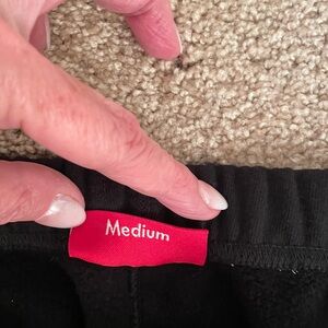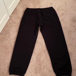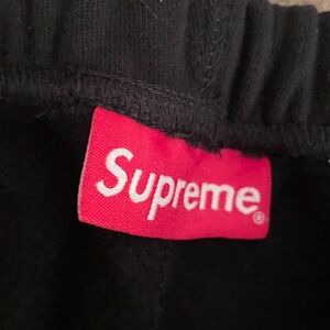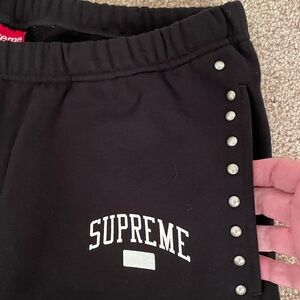 Like new, never worn (live in AZ) Supreme black studded sweatpants from the FW18 collection. Tried on but not worn. Elastic at ankle. Waist has interior drawcord. Black cotton fleece with silvertone studs along outer seams. Two on-seam hand pockets, and one back patch pocket. Back pocket has Supreme logo tag. Printed logo on leg. Size Medium. Beautiful Supreme quality!