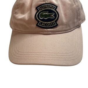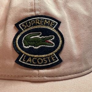 Keywords: Supreme Lacoste, 6-Panel Cap, unisex, pink cap, cotton twill, adjustable strapback, embroidered patch, casual cap, spring fashion, pre-owned cap.
