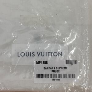 The product is a rare and highly sought after Supreme x Louis Vuitton LV Monogram Bandana Scarf in red, made 100% authentic. This stylish accessory features the iconic LV monogram pattern and Supreme branding, making it a unique and luxurious addition to any man's accessory collection. Crafted from high-quality wool fabric and accented with logos, this scarf is a symbol of sophistication and style. Made in Italy, this exclusive item showcases the collaboration between two renowned luxury brands.