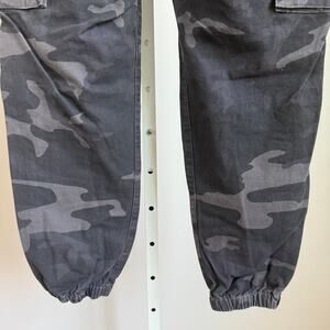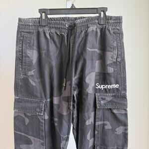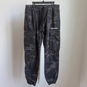 These are pre-owned Supreme x The North Face cargo pants, size Large. The pants feature a black and gray camouflage pattern throughout. The word "Supreme" is printed in white on the front left cargo pocket. The North Face logo is embroidered on the right cargo pocket. They have an elastic waistband with a drawstring. The pants are made of 100% cotton. There are no visible stains or tears.