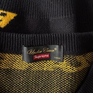 Bold Supreme sweater with eye-catching Navy blue & yellow design. Perfect for a standout look. Size Large, worn once.
