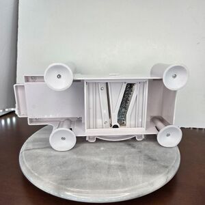 Features: Hand-crank operation, spike disk to hold produce, powerful suction cup feet for stability, internal blade storage compartment, plastic body with metal cutting blades, all parts listed as dishwasher safe on box.