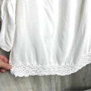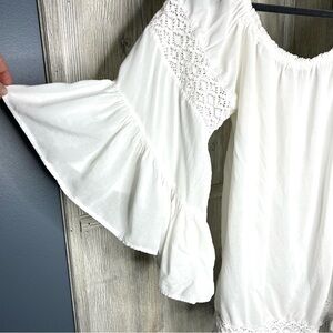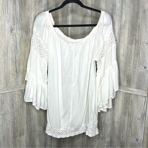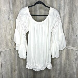 Pair with Shorts or wear as a Beach Cover. On or off Shoulder. Crochet Detail on Bell Sleeves. Approx Measurements pit to pit 20”, Length from Shoulder to Bottom 28”.