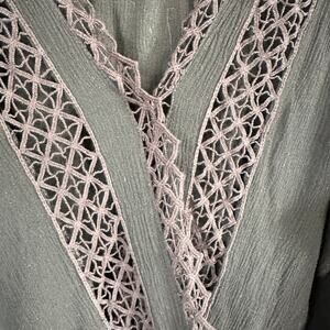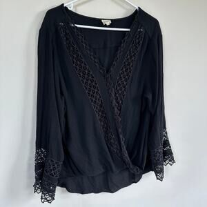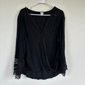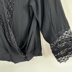 Surf Gypsy Boho Faux Wrap Top Lightweight Black Lace Long Sleeve V-Neck MEDIUM