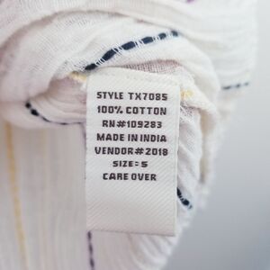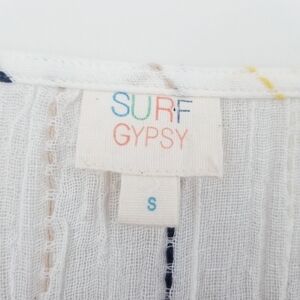 Surf Gypsy. Size S. Cream/Yellow/Black/Purple/Tan. Sunset Stripe. Long Bell Sleeves. Split V-Neckline. Tassel Neck Tie. Lace Inset. Crochet Trim at Hem. Tiny Pom Pom Detail. High-Low. Textured. Lightweight. Semi-Sheer. 100% Cotton. Hand Wash.