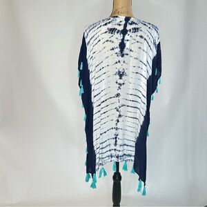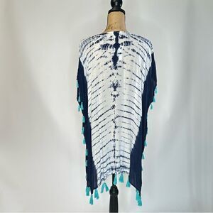 Printed Tassel Trim Cover Up V-neck super cute tie dye blue and white with a pop of color teal tassels