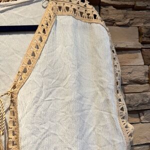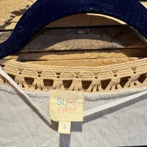 This elegant cream tunic blouse by Surf Gypsy features a stylish tie front, adding a touch of sophistication to your wardrobe. The blouse's flowing design and subtle texture make it perfect for both casual and dressy occasions. Its versatile style ensures it pairs beautifully with a variety of bottoms, making it a must-have top for any fashion-forward individual.