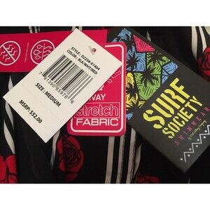 New with Tags $52, Surf Society men's Stripes & Roses Printed Swim Shorts Swim Trunks, size Medium x 7 inch inseam, UV protection & quick dry fabric with mesh lining, drawstring elastic waist, front slash pockets and back welt pocket, above-the-knee length with 25 inch leg opening.
