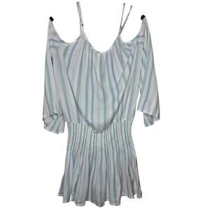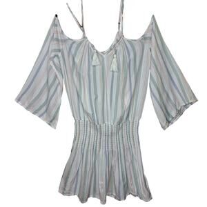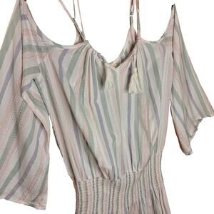 New with tags size large from surf gypsy womens diane off the shoulder striped shirred smocked waist mini dress flowy soft fabric white with pastel tone stripes bell style sleeves and tasstelled neckline and adjustable straps very flattering and comfortable