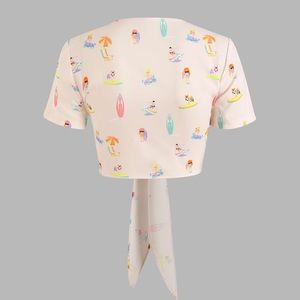 Fun surfer print wrap crop top. Lightweight fabric 95% polyester 5% spandex.