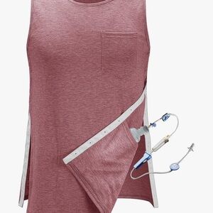 This fitted tank top features a soft pink hue and a classic rounded neckline, offering a comfortable and stylish fit. The sleeveless design and straight-cut hemline make it a versatile addition to any wardrobe. Surgery tank with three internal pockets for drains. Snaps along sides and shoulders to remove