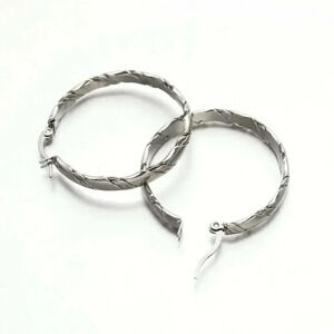 304 Surgical Stainless Steel Silver Twisted Rope Flat Round Hoop Earrings 36mm Premium quality hypoallergenic surgical steel jewelry that doesn't fade, rust, or tarnish Measurements: 36x4.5mm Color: Natural silver stainless steel color Features and Design: Artsy carved flat twisted rope round hoop design, angular mid-century minimalist designer flair HP N029-22