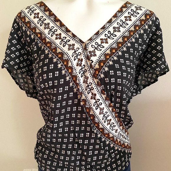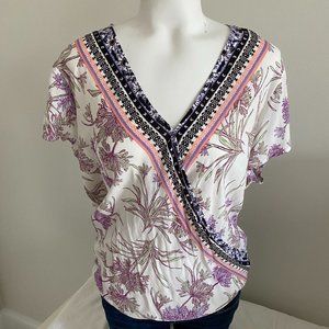These beautiful shirts are identical except for their pattern and colors. This shirt is extremely versatile with its surplice neckline and long shirt tail/hem in the back. The colors and patterns are vibrant and exactly what you need to brighten your summer wardrobe. Material is a cotton polyester mix, giving the shirt a slight sheen and a super lux feel.