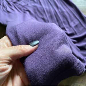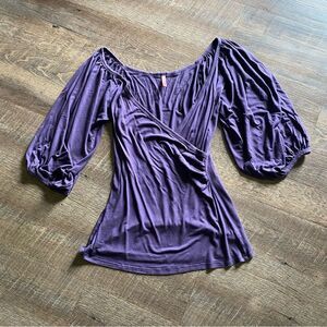 Eight Sixty Surplice cross front top in beautiful purple. Plus size 1. Versatile top: easy to dress up or wear casual. Please see photo section for approximate flat measurements + light piling throughout from use. Note: there is no material tag in this top. It is a soft stretchy material.