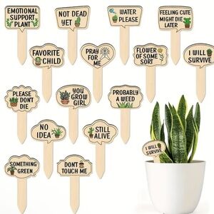 Introducing our Surprise Pack featuring 3 unique garden stakes: These Hilarious Garden Stakes add personality to your garden or herb bed! Receive 3 out of 15 witty and amusing phrases such as "Emotional Support Plant," "Feeling Cute Might Die Later," and "Don’t Touch Me!" See below for the full list of included phrases. Included Phrases: 1. Emotional Support Plant 2. Favorite Child 3. Please Don’t Die 4. Something Green 5. No Idea 6. Don’t Touch Me 7. Water Please 8. I Will Survive 9. You Grow Girl 10. Not Dead Yet 11. Pray For Me 12. Still Alive 13. Probably A Weed 14. Flower of Some Sort 15. Feeling Cute Might Die Later Size: Approximately 3.4" long and 2.7" wide. Made out of Basswood. Waterproof & Mildewproof. Feel free to ask any questions you may have!