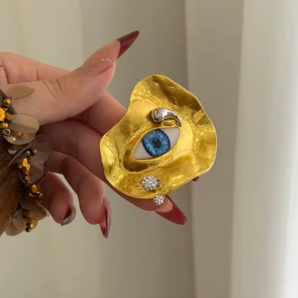 Make a bold statement with this eye-catching gold ring. Featuring a unique eye design with blue and silver accents, this piece is perfect for adding a touch of intrigue to any outfit.