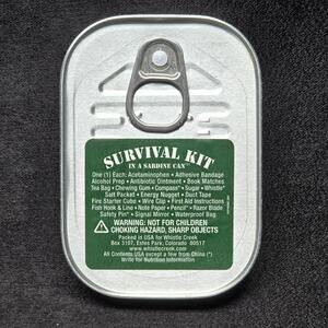 Survival Kit in a Can Emergency Sardine Can Bandage Ointment Tea Gum Compass and more.