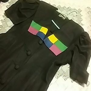 Susan Bennett Black buttons down front, long below knees, short sleeves with pleats on shoulders , very nice and dressy,tailored, has a flap off the shoulders front and back*(.cape like) new