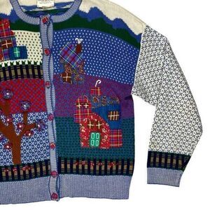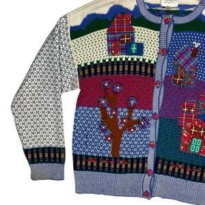 - Description: Susan Bristol 1991 Ugly Cardigan Sweater Women L Blue Red with Applique Vintage