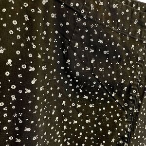 Cute black capri pants with a white geometric-like all-over print. These pants have a zipper on the side for closure. There are no pockets. The print looks like mini peace signs. No stretch in the pants and has normal wash wear.
